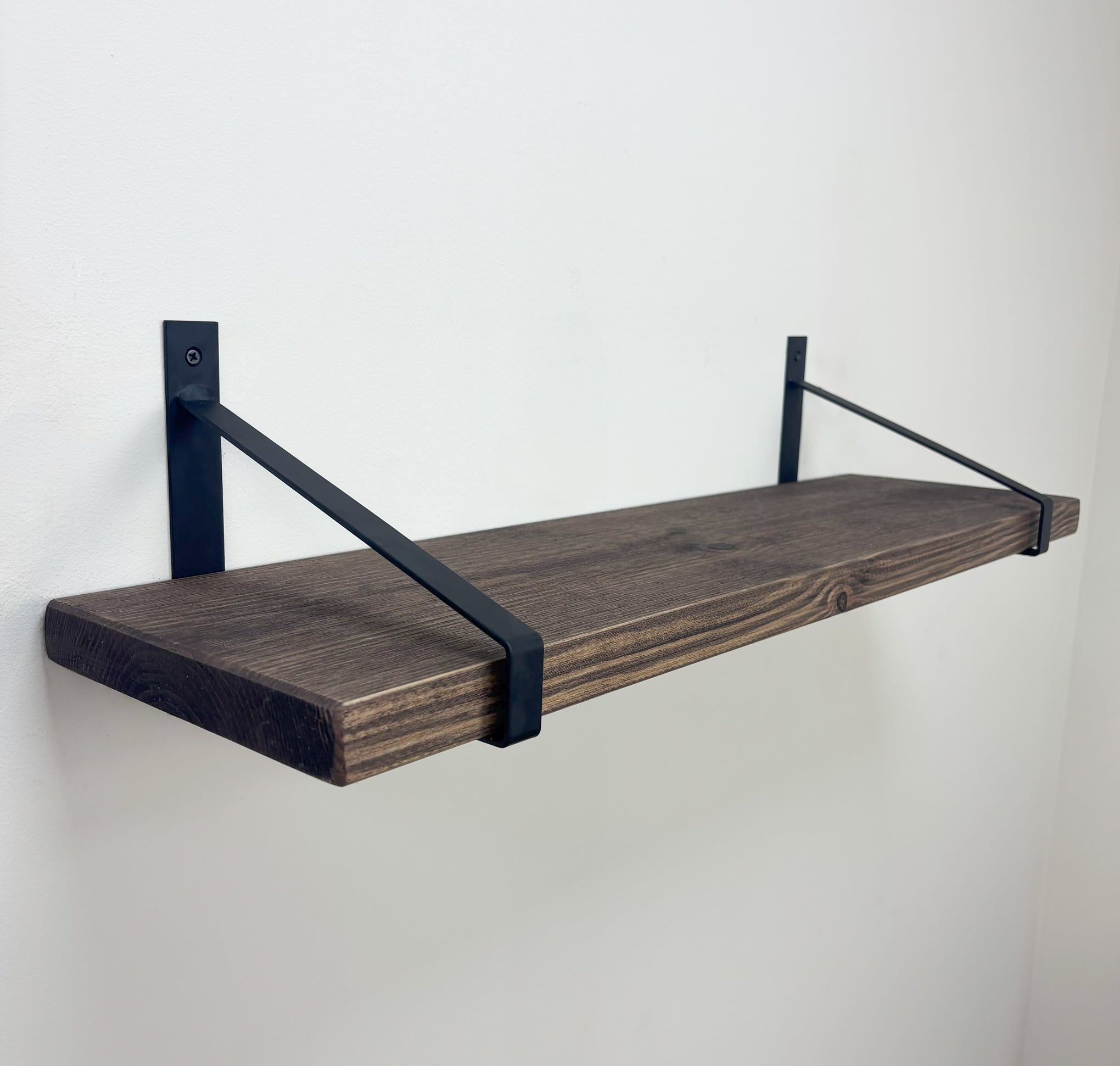 Industrial style brackets in the very popular 'belt bracket' style, combined with our most popular shelf - for a cleaner, leaner profile
