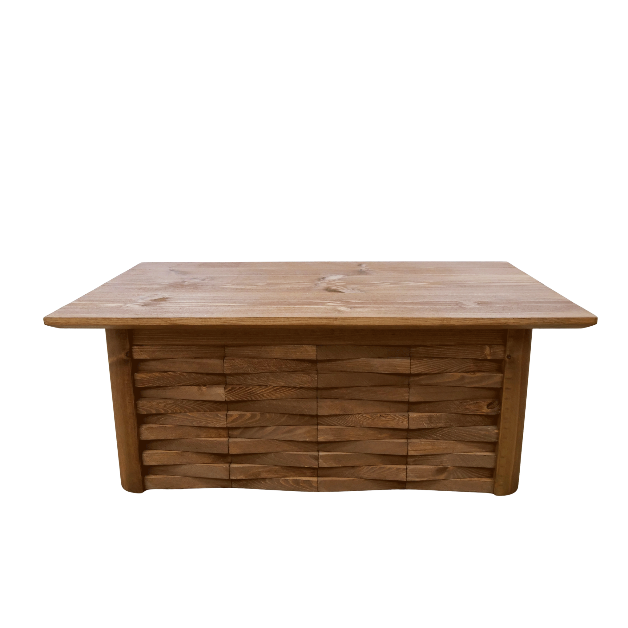 A sculptural pedestal coffee table with a hinged top for hidden storage, finished with rustic 3D detailing for a bold modern centrepiece.
