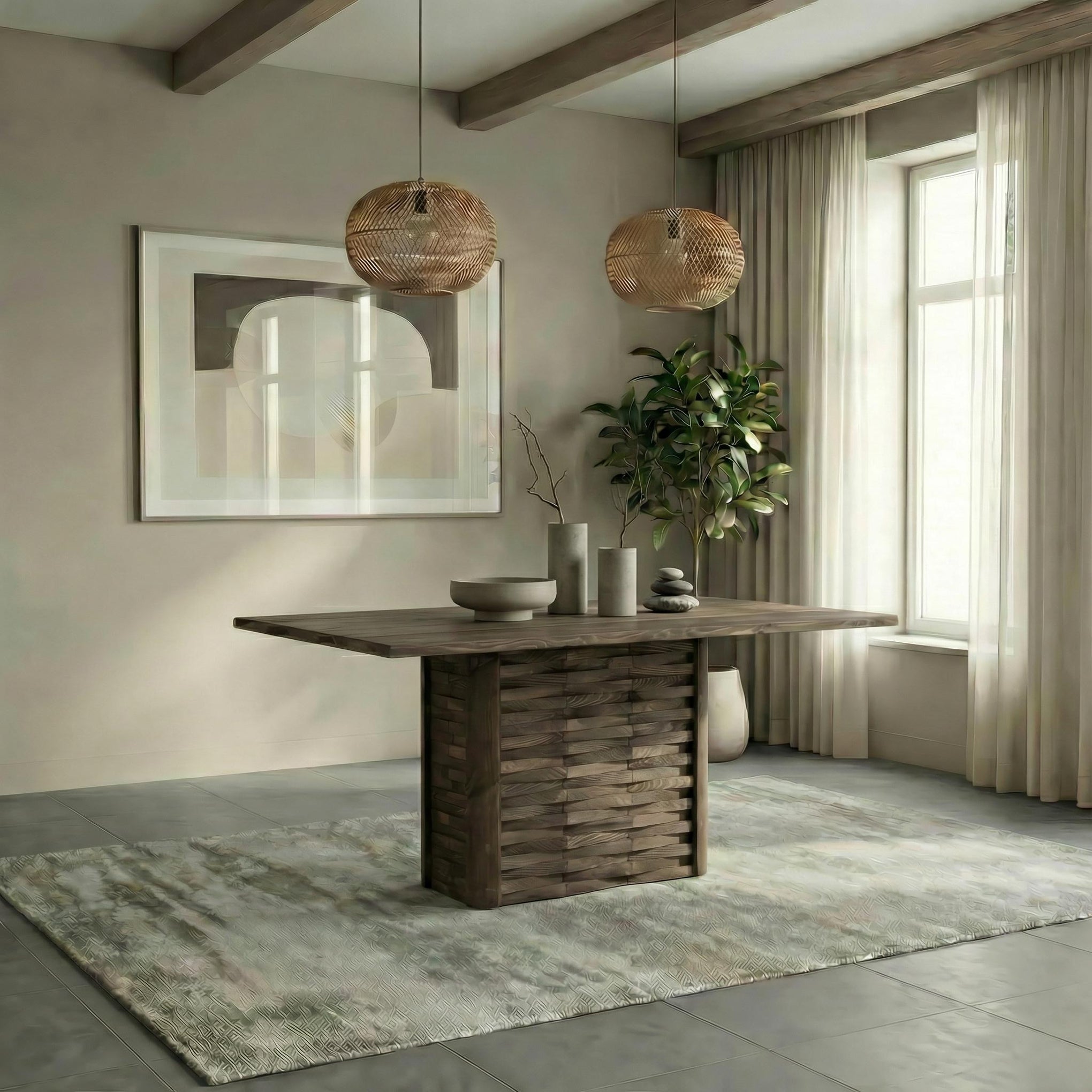A modern dining table featuring a smooth solid-wood top balanced by a sculptural trunk-style base with a dimensional 3D wedge-patterned texture