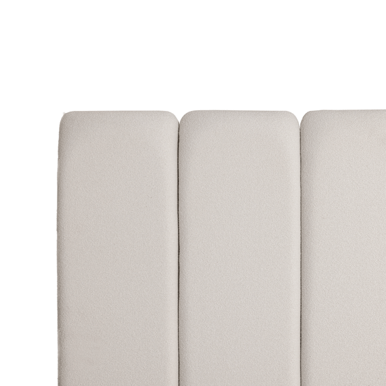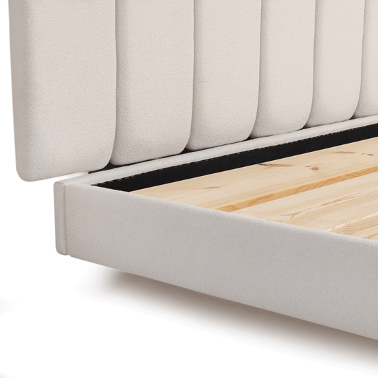 Defined by its hidden recessed base, this upholstered bed frame is carefully designed to stay out of sight, creating the striking illusion of a floating design. Precision-cut angles and clean, modern geometry give the frame a balanced look.